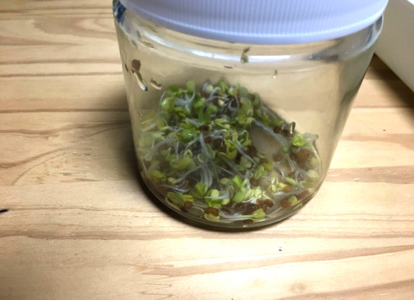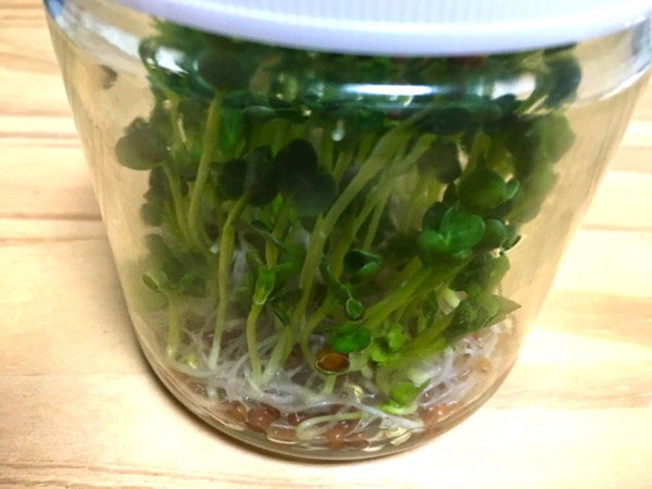 あとはこの容器の場合、2日に一度くらい水を入れ替えたりさえしておけば勝手にニョキニョキとスプラウトが育ちます。