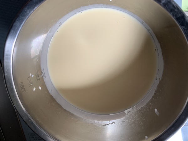 最初に牛乳、生クリーム、バニラエッセンスを混ぜて軽く温める。